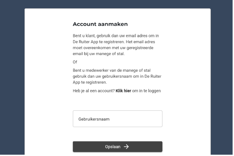 Vul in het veld “Gebruikersnaam” het emailadres in dat je aan de manege hebt doorgegeven. En druk daarna op “Opslaan”